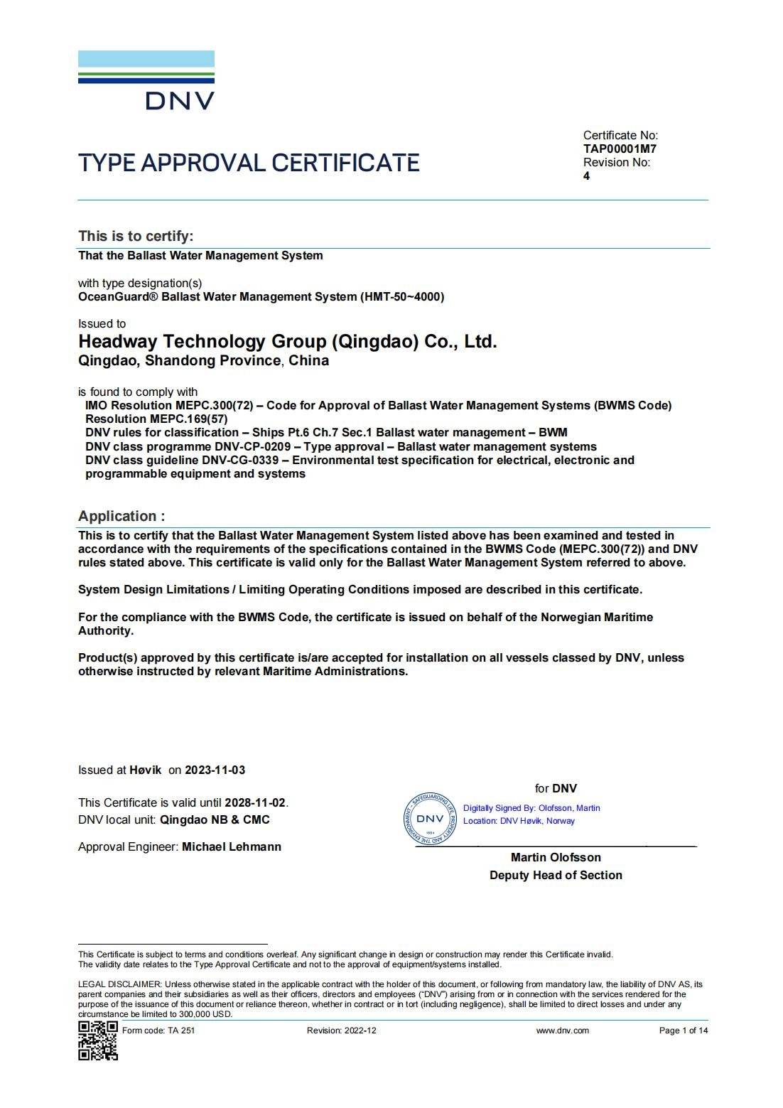 海洋衛士?壓載水管理系統(BWMS)采用“電催化高級氧化技術”,具有單次處理、體積小、無氫氣、超低能耗,以及不受水域鹽度、溫度、濁度影響等優勢。系統擁有涵蓋近20個主流船級社和船旗國在內的全面認證,訂單量與市場份額穩居世界前列。