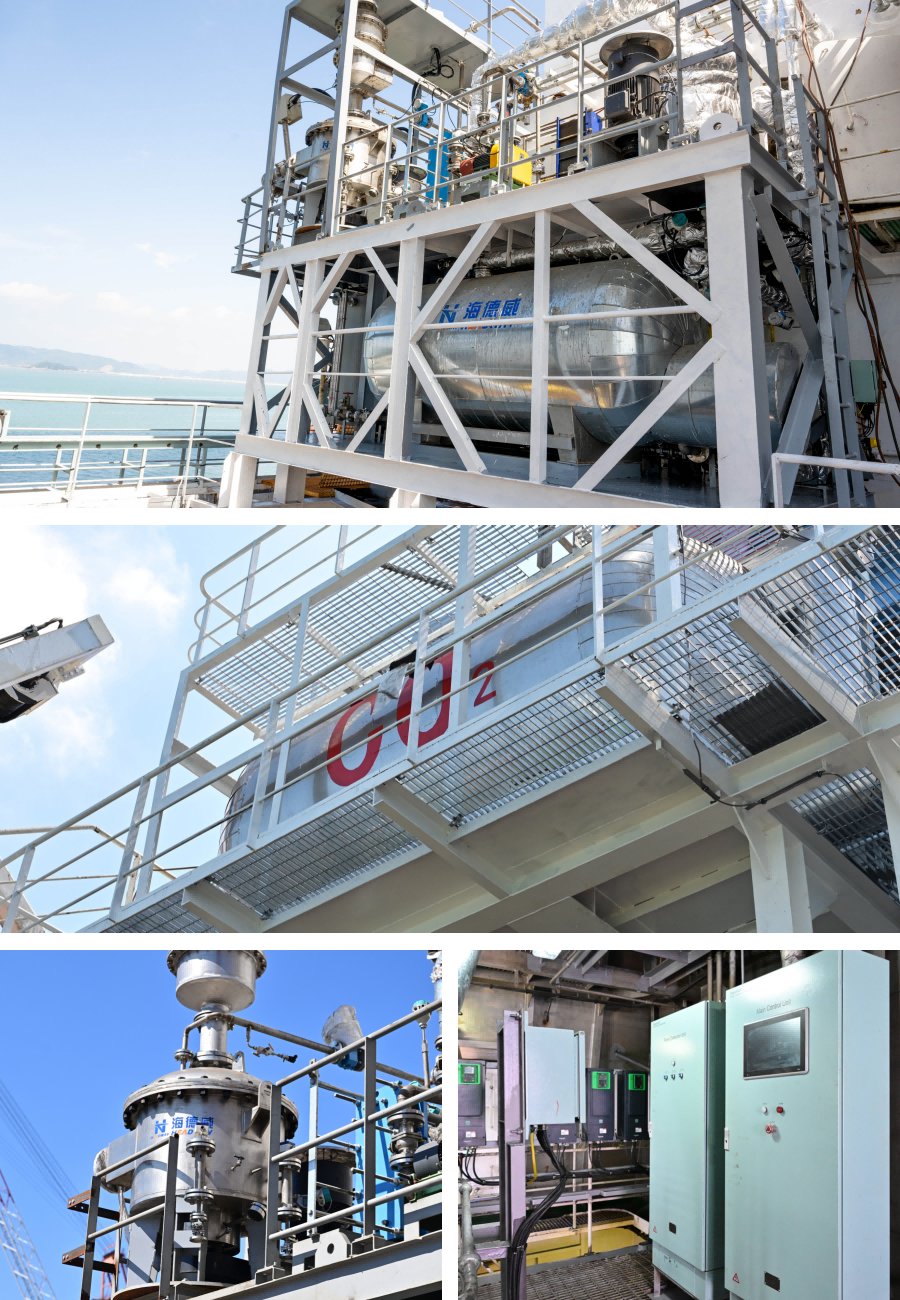 該項目由浙江自貿試驗區舟山管委會、海德威科技集團、廣東粵電航運有限公司、舟山市龍山船廠有限公司、國能新能源技術研究院及中國船級社上海規范研究所共同推進。作為項目核心——海洋衛士?船載碳捕集系統由海德威自主研發、設計與生產,整套解決方案涵蓋二氧化碳吸收與解析模塊、液化壓縮模塊及二氧化碳儲罐等。此次高速離心脫碳技術在國內實船中的首次商業化應用,為船載二氧化碳捕集提供了更具競爭力的新路徑。
